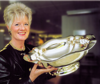 Billedgalleri - T. Fredberg guld- og sølvsmedearbejder Specielle guld- og sølv opgaver Her viser vi et lille udpluk af særlige guld- og sølv opgaver, vi har designet og fremstillet. Her er produkterne ofte i massivt sterlingsølv og er skænket til blandt andet kongehuset m.fl. Vores vigtigste forretningsområde er design og fremstilling af kirkesølv og andre kirkeartikler mm. til Danske og Norske kirker. Nogle af de mest spændende opgaver er restarering, ofte af mange hundrede års gammelt kirkesølv. | Sølvvarerne er ofte eksklusive gaver: Fiskefadet som bryllupsgave til Kronprinseparret Mary og Frederik, Sølvjardiniere til Joachim og Alexandra fra Farsø Kommune. Opgaver bestilt af det Norske kongehus, gaver skænket til det Norske kongehus. Borgmesterkæder til Farsø kommune og Vesthimmerland Kommune. Hjemmedåbssæt blandt andre til Aalborg Sygehus skænket af Odd Fellow. Mange dåbsfade, altersølvsæt og meget merre til kirker. |  | Fiskefad til Mary og Frederik Gave fra Farsø Kommune til Kronprinseparret i anledningen af deres bryllup den 14. maj 2004. Designet af Tonny Østergaard. Fadet er 68 cm lang, 28 cm bred og 11 cm høj forarbejdet i ren sterlingsølv med forsølvet rist. Æsken som fadet blev leveret i er fremstillet af Lene Olesen. | | Vesthimmerland Kommunes nye borgmesterkæde Tonny Østergaard har designet den nye borgmesterkæde. De lokale pengeinstitutter står bag finansieringen af kæden, der består af 164 g 14 karat guld og 537 g sterlingsølv. Kæden indeholder det nye kommunevåben og symboler der fortæller om de fire tidligere kommuner. Aars-tyren fra Aars en rose for Aalestrup, en krone og et jagthorn for Farsø der huser den kongelige jagthytte i Trend og to muslinger danner et hjerte for Løgstør. På ryggen er kæden samlet med et gudeansigt fra Gundestrupkarret. |  | | Sølvjardiniere til Prins Joachim og Alexandra Gave til prinseparret fra Farsø kommune i anledningen af deres bryllup i 1995. Jardinieren er 50 cm lang, 40 cm bred og 32 cm høj i massivt sterlingsølv. Den er et let hamret håndarbejde designet af Tonny Østergaard. Her vises Jardinieren frem af Farsø's tidligere borgmester Jette Thomsen. Jardinieren kan anvendes til borddekorationer med blandt andet blomster eller frugter. Sølvjardiniere til Kronprins Haakon og Mette-Marit Tilsvarende sølv jardiniere blev skænket det norske kronprinsepar i anledningen af deres bryllup den 25. august 2001 af Oslo Militære Samfund. |  | |  | Hjemmedåbssæt skænket til Aalborg Sygehus Sættet til brug ved dåbshandlinger på Aalborg Sygehus er skænket af Odd Fellow Ordenen. Hjemmedåbssættet bestående af fad og kande i hamret sterlingsølv, samt attachemappe. Fadets hamring, som stråler ud fra centrum, illustrerer den opstigende sol som symbol på opstandelsen og det evige liv. Dåbskanden indeholder 1/4 liter og er 10,5 cm høj. Fadets diameter er 22 cm. I alt ca. 560 g. sterlingsølv.  Vi har i alt fremstillet 5 sæt hjemmedåbssæt i forskelligt design til Sygehuse. |  | Drikkebægre til officersmesse 10 drikkebægre til officersmesse i massivt sølv med delingens eget våbenmærke. | Farsø Erhvervspris sølvfad Sølvfad der hvert år tildeles en fremtrædende lokal virksomhed i Farsø af Farsø Erhvervsråd. Logo og tekster er graveret på egen graveringsmaskine. |  |  | Vandrepokal for DM i Ishockey Vandrepokal til Ishockey DM er udført i forgyldt sterlingsølv. | Sølvstager på en meter Lysestager fremstillet i rent sterlingsølv for norsk kunde, fotograferet sammen med Karen. |  | | | | | | | |