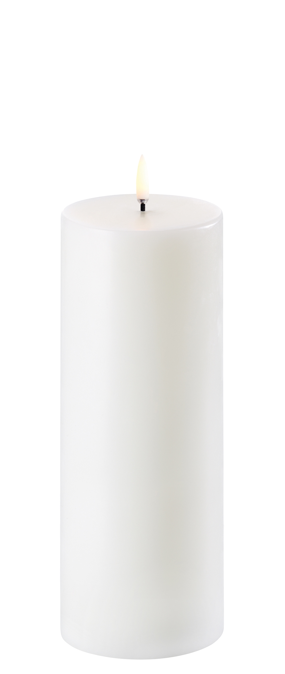 Bloklys LED Nordic White 7,8x20 cm har en unik 3D-flamme, der til forveksling ligner flammen fra et traditionelt stearinlys. Takket være LED-teknologien, har Uyuni Lighting skabt en serie af LED-stearinlys, der ligner en levende flamme, som står og blafrer let. Flammen har ingen fysisk bevægelse, og du slipper derved for at bruge strøm på at holde bevægelsen i gang.